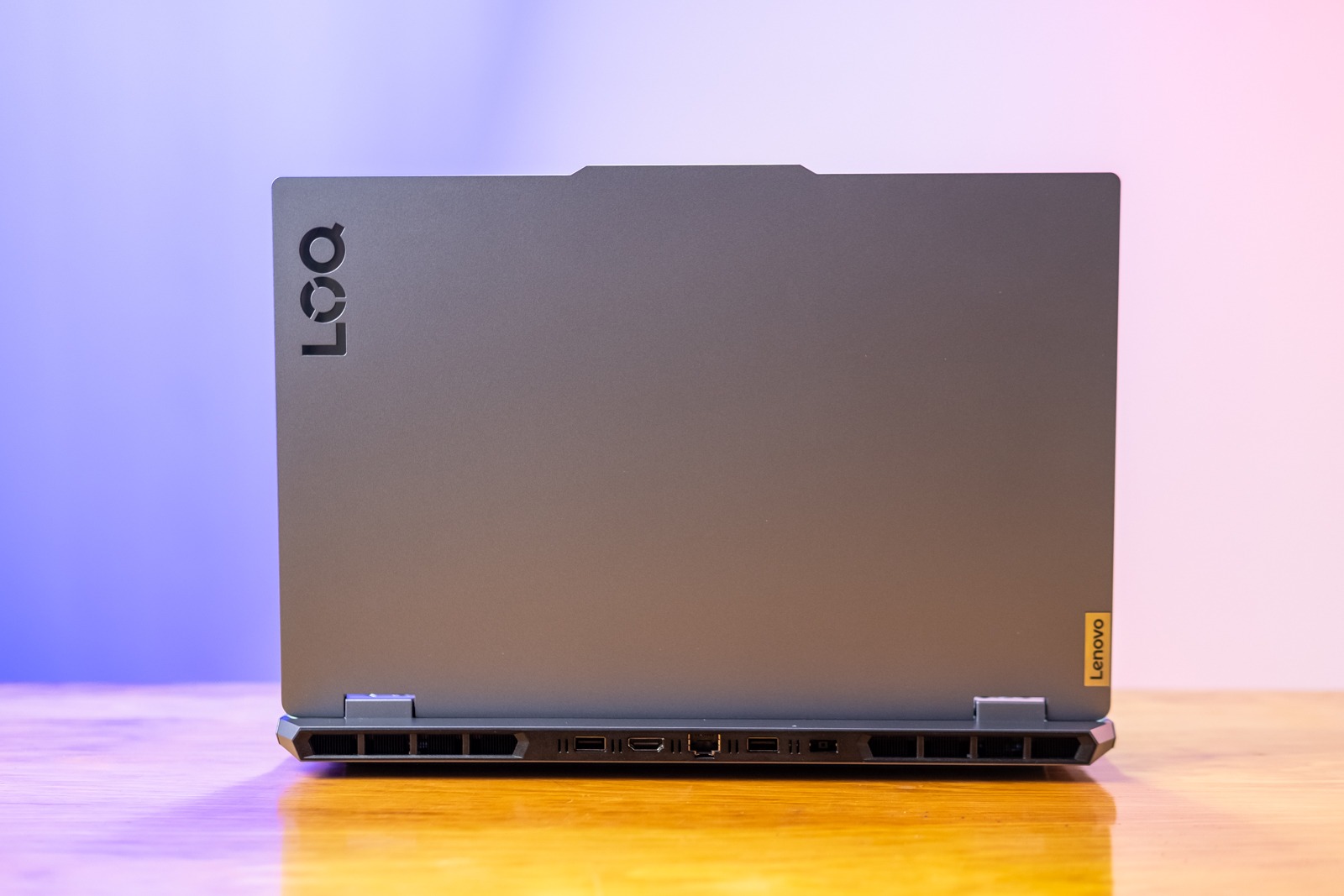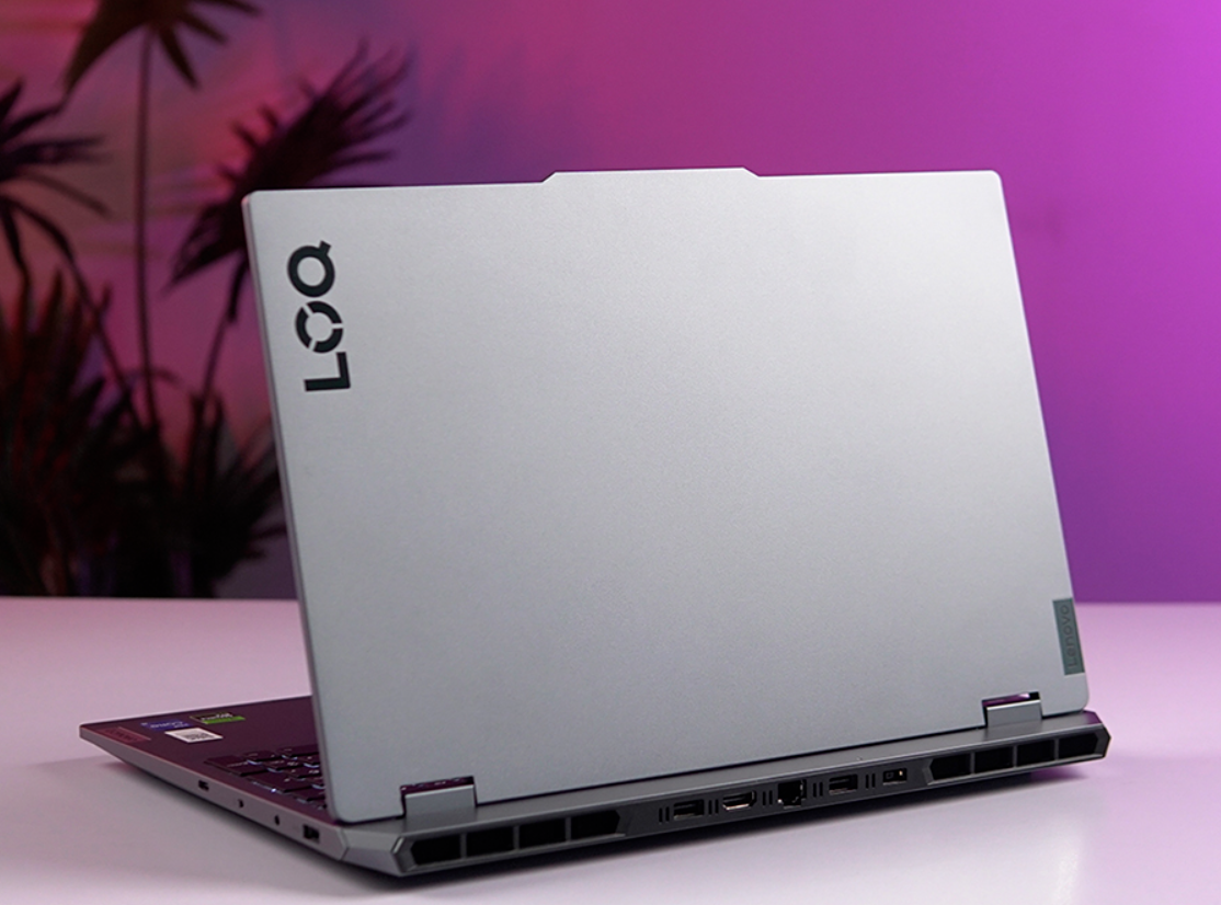 Về thiết kế, LOQ 15AHP10 thừa hưởng gần như trọn vẹn ADN của dòng Legion với hốc tản nhiệt hầm hố phía sau và các cổng kết nối được bố trí khoa học ở mặt lưng. Cách sắp xếp này giúp game thủ đi dây gọn gàng hơn, không bị vướng víu khi sử dụng chuột ở hai bên cạnh máy.