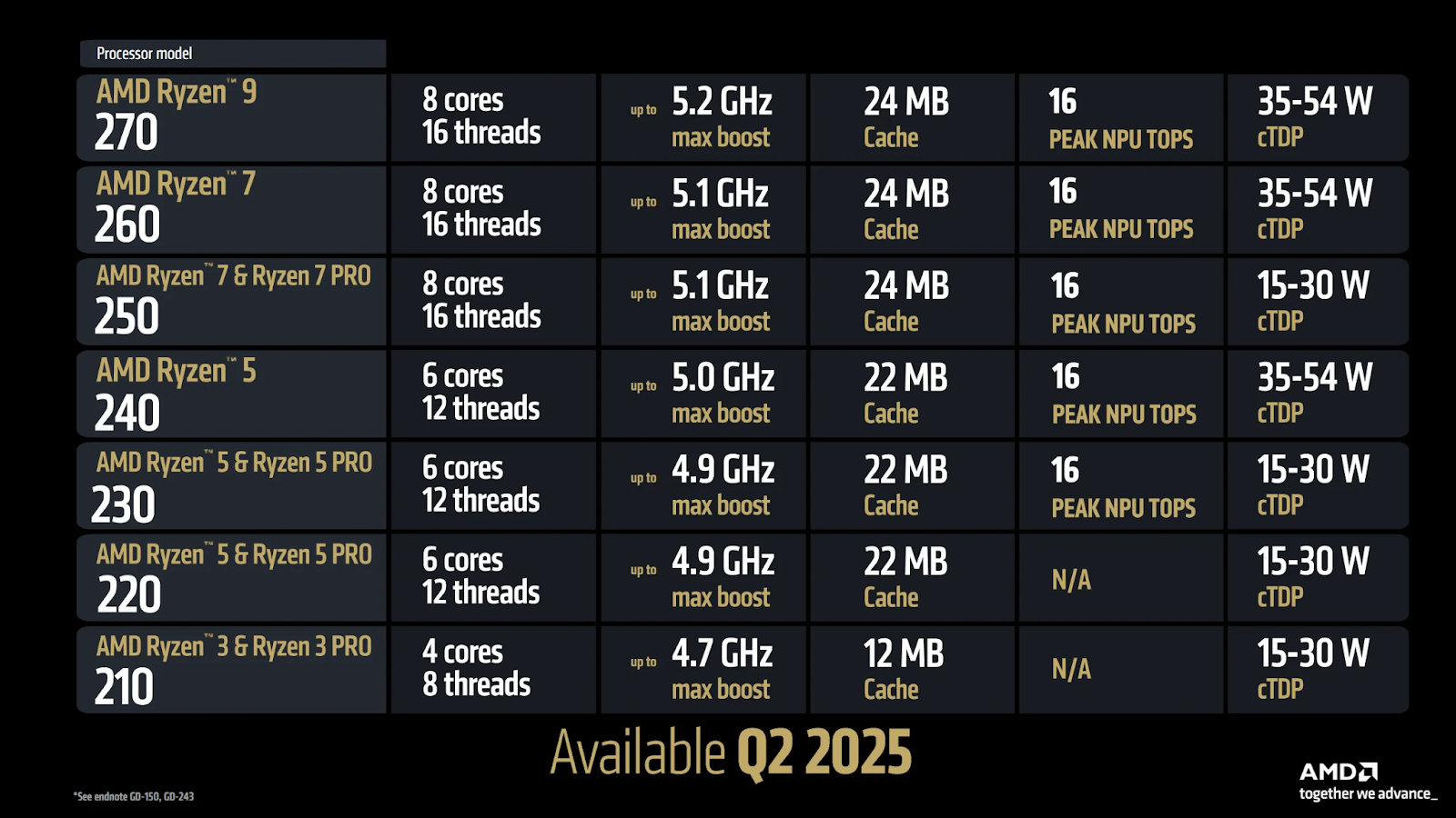 Như vậy với việc làm mới toàn bộ dòng sản phẩm, các sản phẩm chip AMD dành cho laptop nay đã dễ phân biệt hơn. Dòng AI 300 (AI cao cấp), dòng 200 (AI tầm trung), dòng 100 (Phổ thông, không AI, Zen 3+) và dòng 10 (Giá rẻ, không AI, Zen 2). Việc "làm mới" Ryzen™ 100 và 10 là một nước đi chiến lược, đảm bảo rằng AMD có một sản phẩm cạnh tranh về giá và hiệu năng ở mọi phân khúc của thị trường.