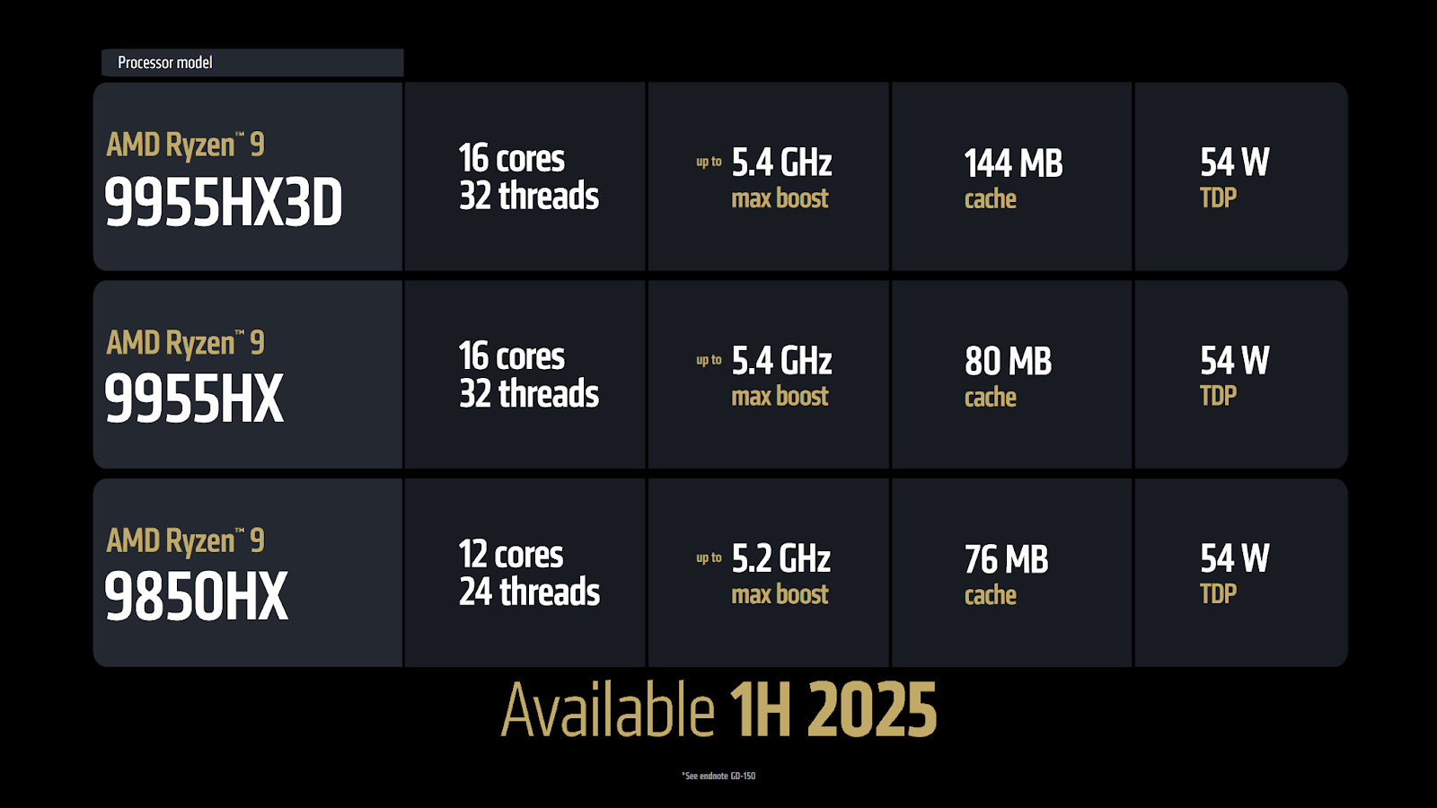 Ngoài các dòng chip tập trung vào AI và phân khúc phổ thông kể trên, ở phân khúc gaming cao cấp, AMD cũng có các sản phẩm chuyên biệt. Được công bố tại CES 2025, dòng Ryzen™ 9000HX "Fire Range" là “chiến thần” gaming mới. Đáng chú ý nhất chính là Ryzen™ 9 9955HX3D (16 nhân Zen 5) trang bị 3D V-Cache, tập trung hoàn toàn vào sức mạnh CPU cho game thủ.